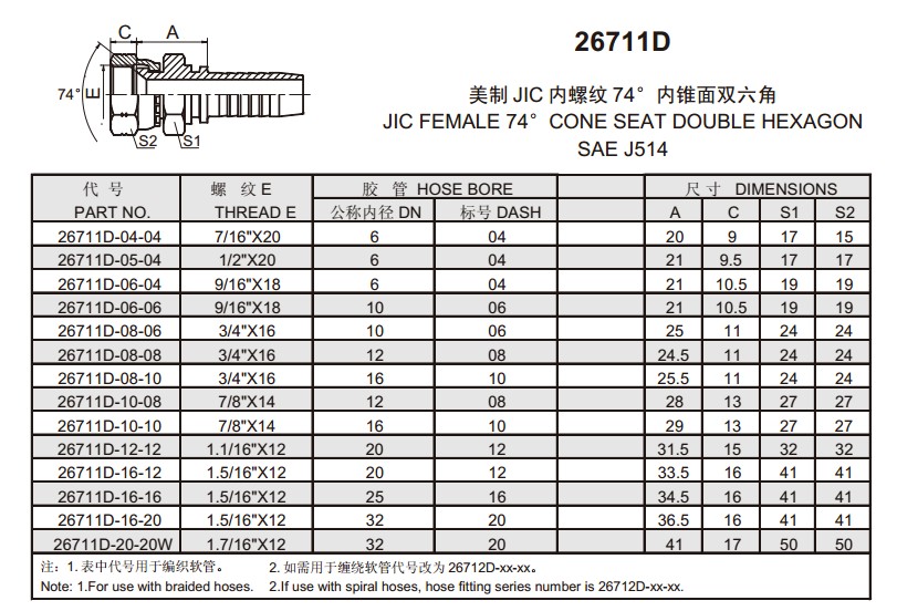 26711D 美制JIC内螺纹74°内锥面双六角