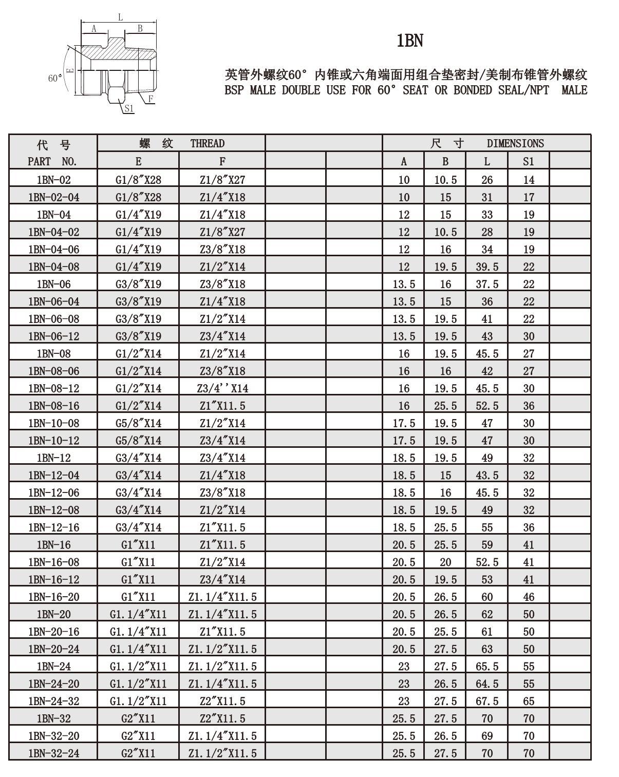 1BN British pipe male thread 60°inner cone or hexagonal end face with combined gasket seal/American cloth tapered pipe male thread