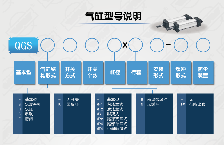 4.用户可根据负载、工作压力、动作方向从我公司样本中的双作用气缸理论输出力表中选择合适的缸径尺寸。